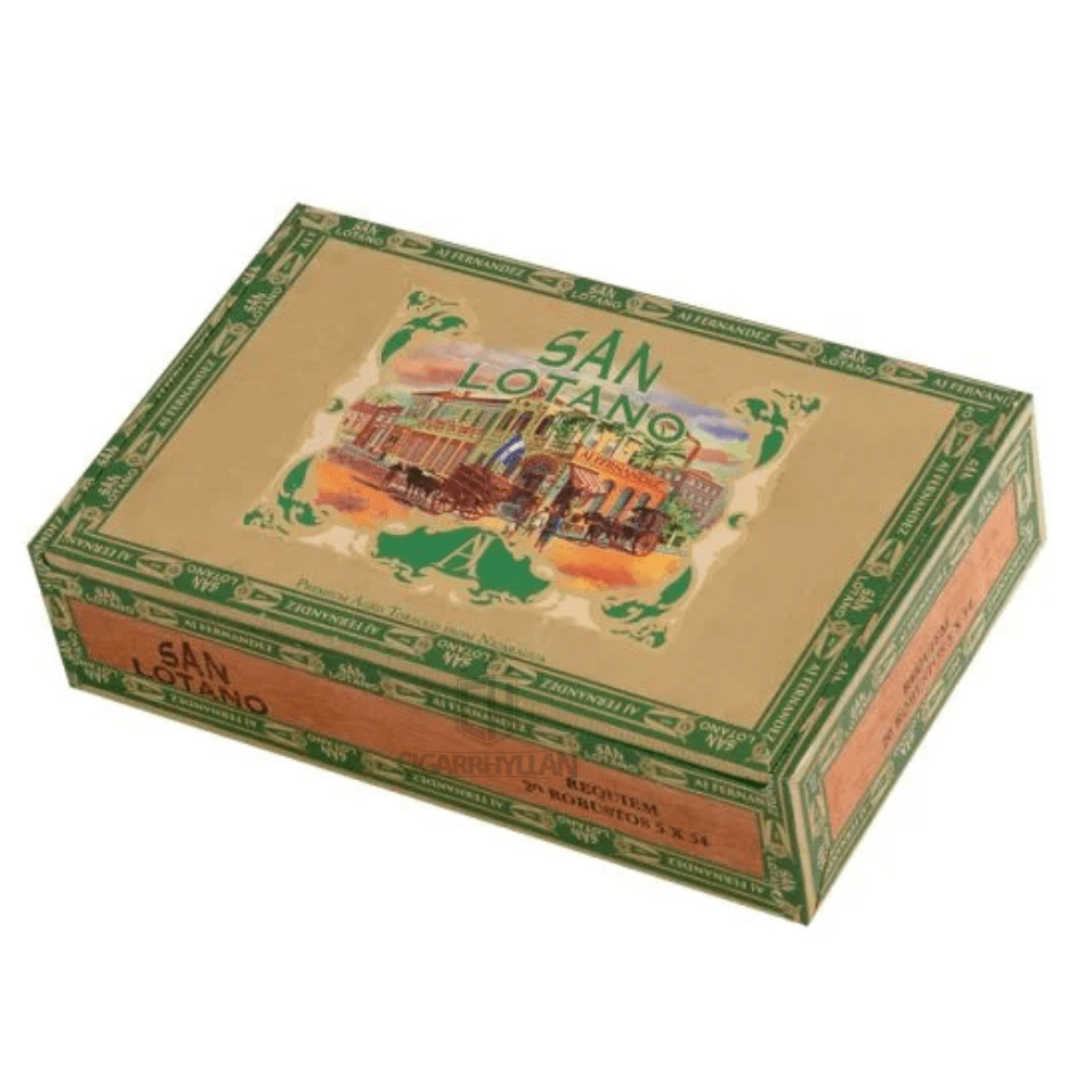 AJ Fernandez San Lotano Maduro Robusto cigarrer är fantastiska premium, genomsyrad av kubansk tradition. Medel till fyllig, men onekligen mjuk, A.J. Fernandez har skapat ett mästerverk som stoltserar med ett mörkt och oljigt madurotäckblad som täcker en trelandsblandning av perfekt lagrad tobak. Detta läckra översta blad tillför mycket peppriga kryddor och chokladtoner, medan fyllnadsmedlen av högsta kvalitet kompletterar receptet med kaffe, nötter, lite jord och kola.