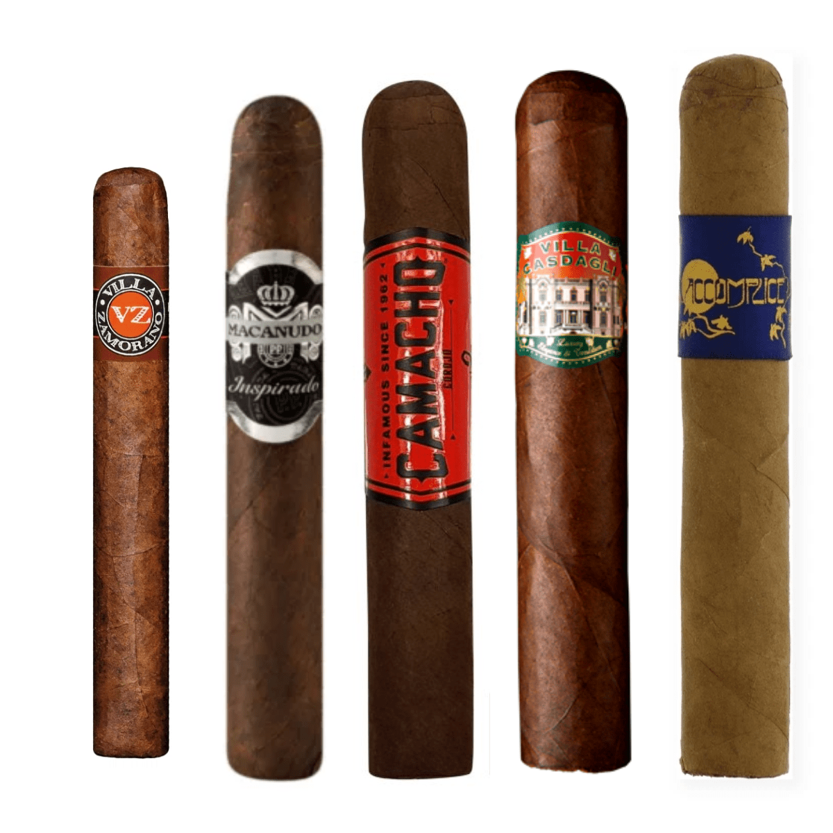 Ett paket med fem cigarrer i olika format och ursprung. Innehåller: