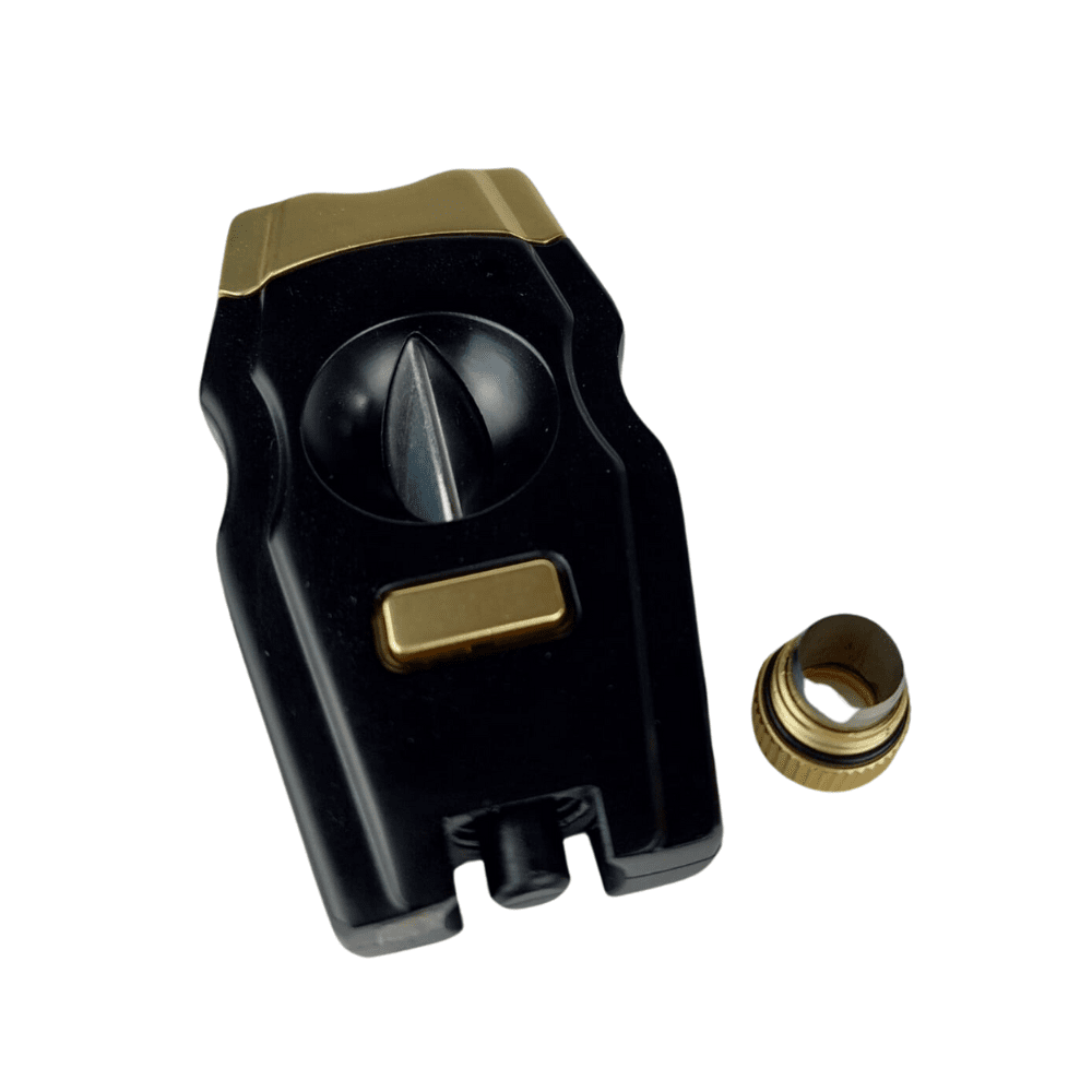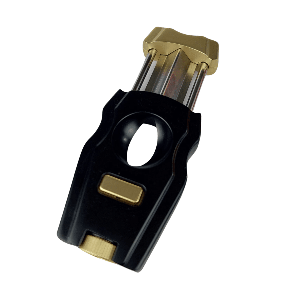 Den mattsvarta finishen, vackert kontrasterad med guldpläterade detaljer, ger inte bara en lyxig känsla utan också ett stilfullt tillskott till din cigarrsamling. Dess slanka och ergonomiska form, tillsammans med ett snyggt rutmönster på baksidan, är inte bara en fröjd för ögat, utan även perfekt utformad för att ligga bekvämt i handen, vilket gör den lätt att hantera.